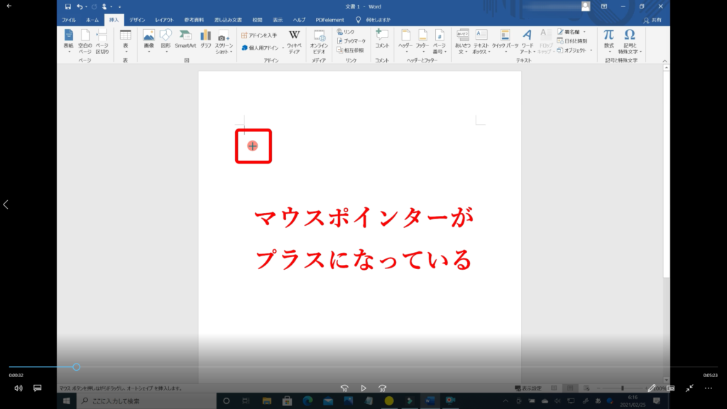 ↓手順④ 本文にマウスポインターを移動させるとポインターが「プラス」になっています。
