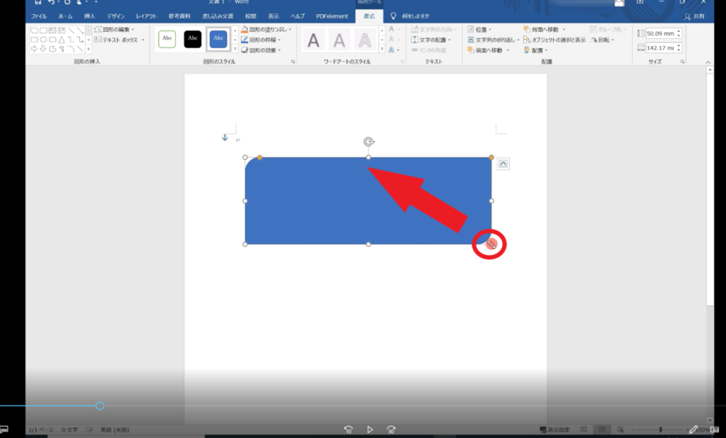 ↓手順① 図形の四方に「白い丸」があるので、そのいずれかをドラッグすると図形が大きくなったり小さくなったりします。下記の画像の場合、「赤丸」をドラッグして矢印方向に動かす。