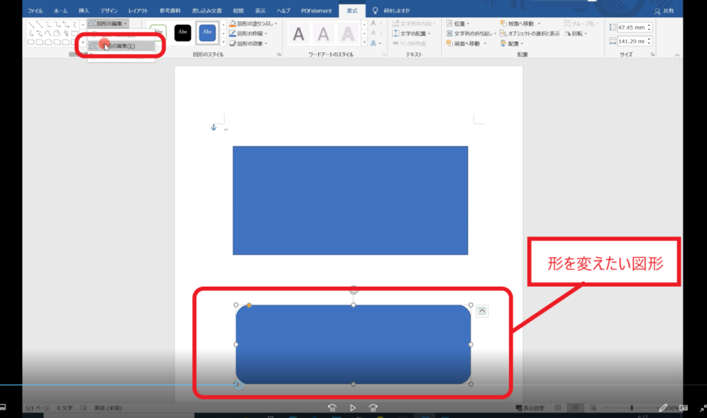 ↓手順① 本文にある図形を違う図形に変えたい時は、その図形をクリックして、「図形の挿入グループ」右上の「図形の編集」をクリックします。