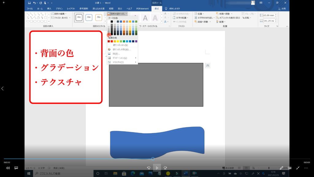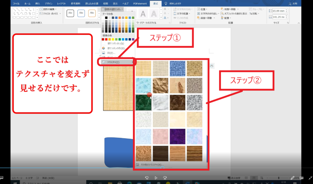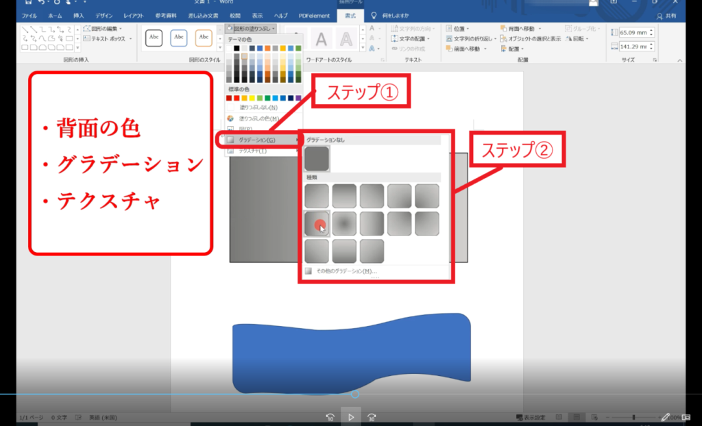 ↓手順① 「図形の塗りつぶし」は、背面の色、グラーデーション、テクスチャを変えられます。下記の画像は背面の色を変えています。