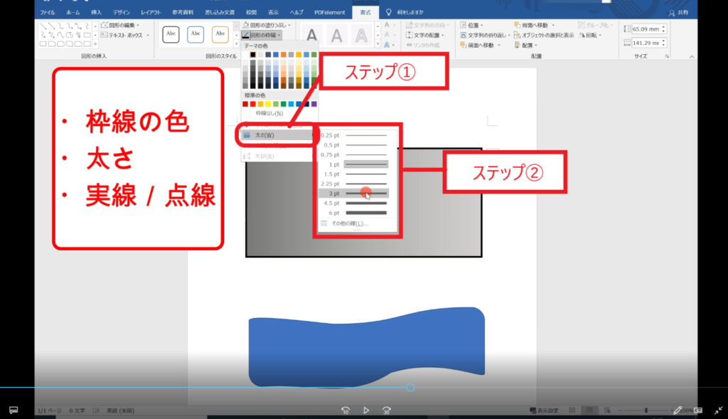 ↓手順① 「図形の枠線」は枠線の色、太さ、実線/点線を変える事ができます。下記の画像は枠線の色を変えています。