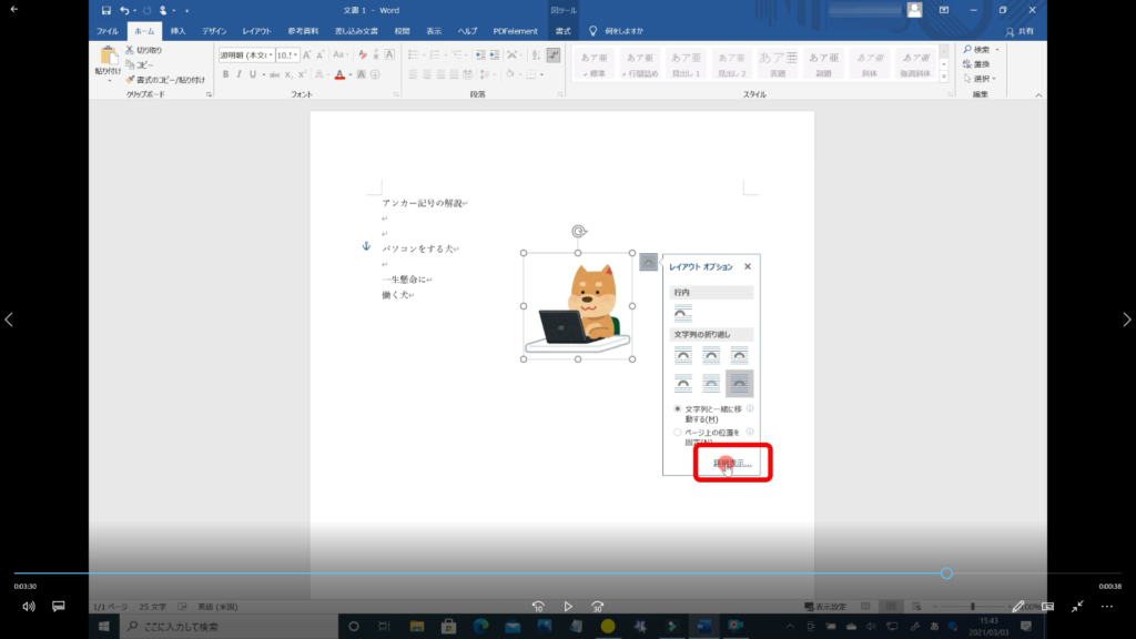 ↓手順① 例えば、下記の画像、パソコンをする犬の段落に「アンカー記号」を固定しておきたい場合、画像をクリックして「レイアウトオプション」の一番下、「詳細表示」をクリックします。