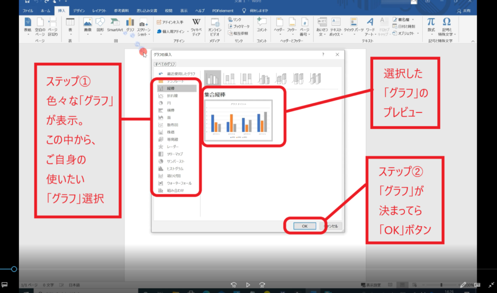 ↓手順② ステップ①の中から「グラフ」の種類を選択し、ステップ②「OKボタン」をクリックします。
