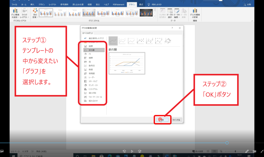 ↓手順② 次のメニューが開きましたら、ステップ①「テンプレート」の中から変更したい「テンプレート」を選択し、ステップ②「OK」ボタンをクリックします。グラフが変更されます。