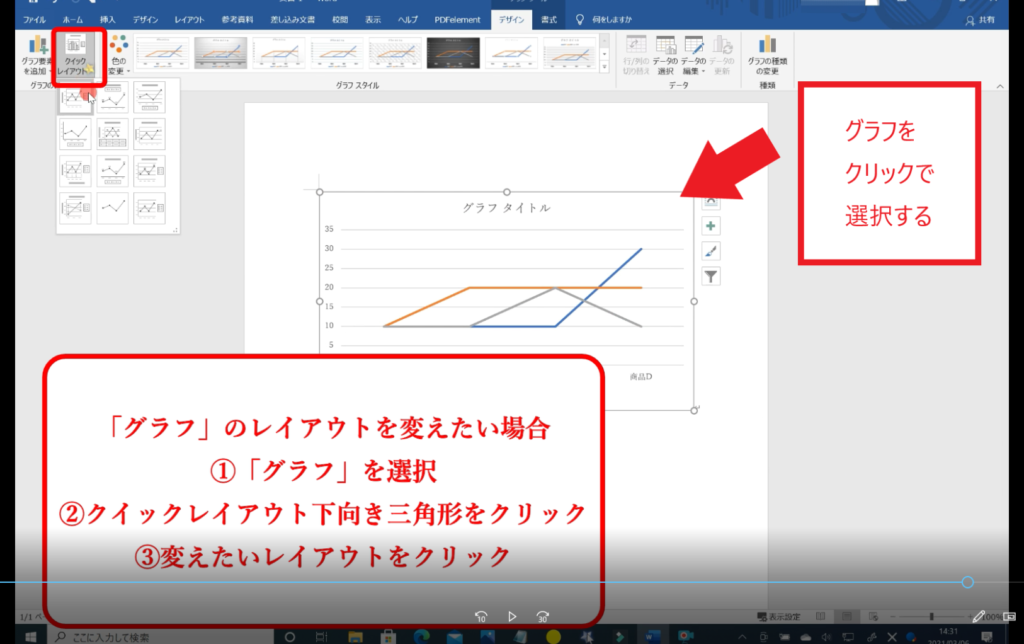 ↓手順① 既存の「グラフ」を選択し、「グラフのレイアウトグループ」内の「クイックレイアウト」をクリックします。変えたいレイアウトをクリックすると、グラフのレイアウトが変わります。