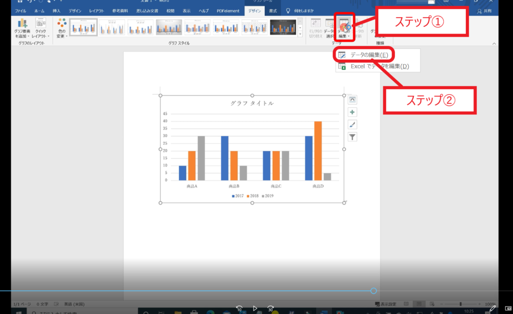 既存の「グラフ」を選択し、「グラフツール」の「デザイン」をクリックし、「データグループ」の「データの編集」をクリック。メニューが開き「データの編集」をクリックすれば、Excelシートが開きます。