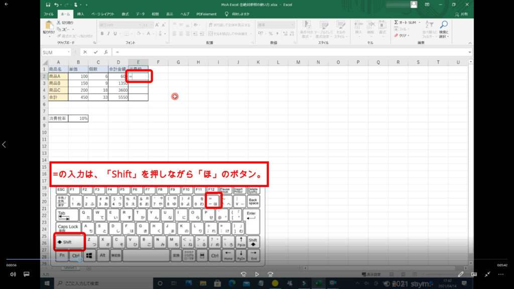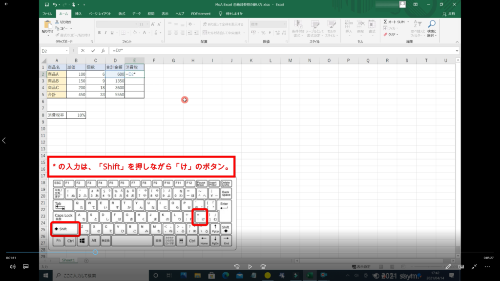 ↓手順③ 合計金額の10%を知りたいので、掛けるのアスタリスクを入力します。アスタリスクはキーボードの「Shift」を押しながら「け」のボタンを押します。