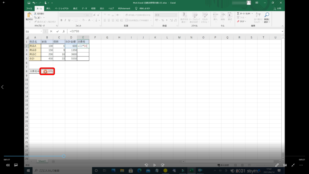 ↓手順⑩ 「=D2*B8」を「=D2*$B$8」にする。