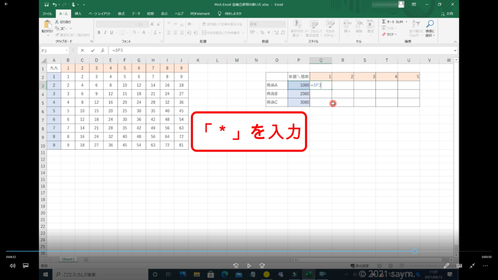 ↓手順② 単価の列は、変わらないので、「F4」ボタンを3回押し、「P」の前に「$」が付くようにします。