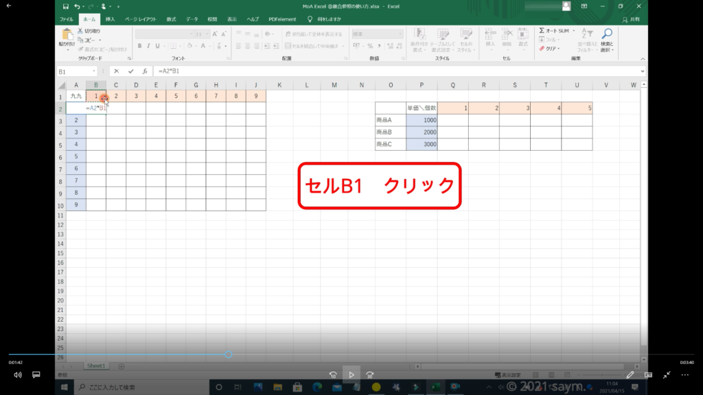 ↓手順⑩ B1の所は、1行目は変わりませんが、列が右に移動していきます。ですから、1行目だけを固定します。