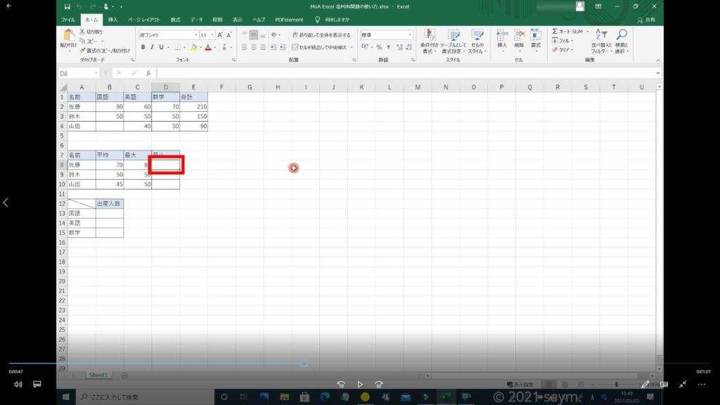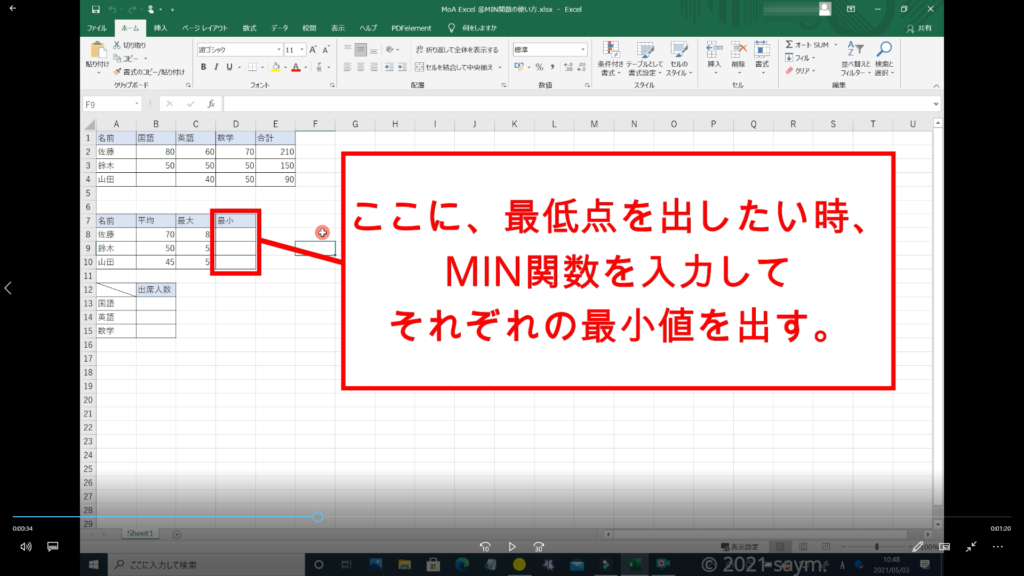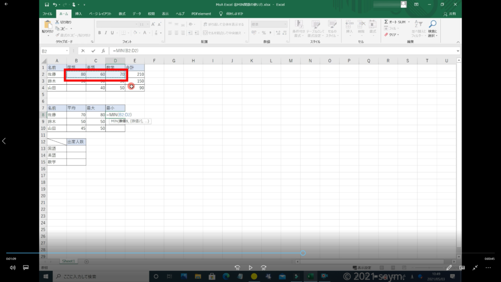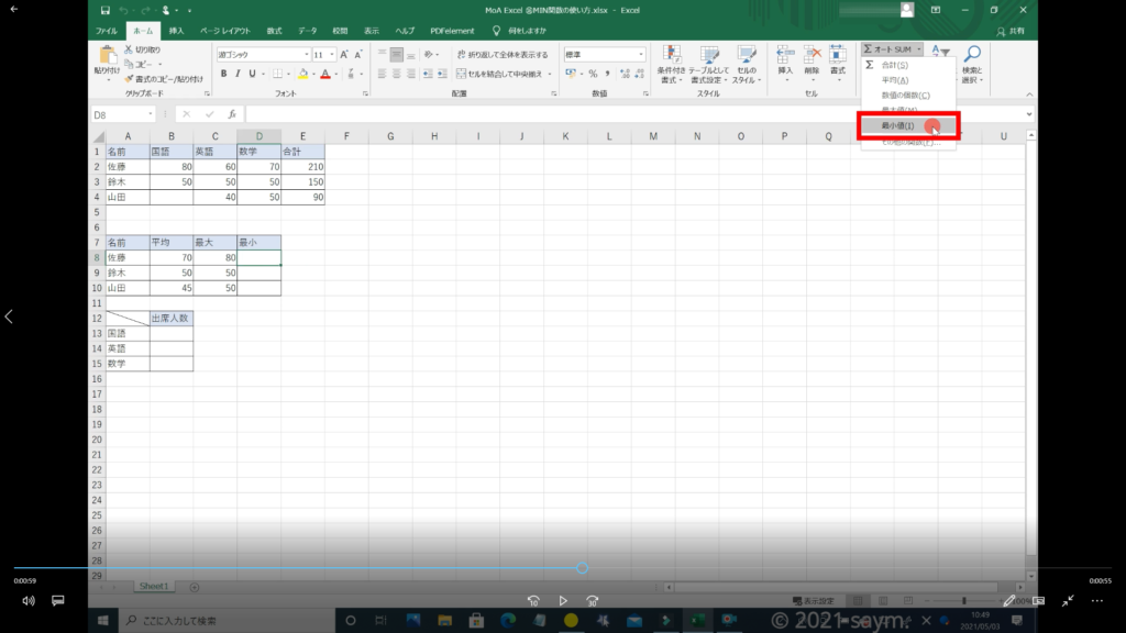 Excel MIN関数/最小値を求める関数の使い方 動画