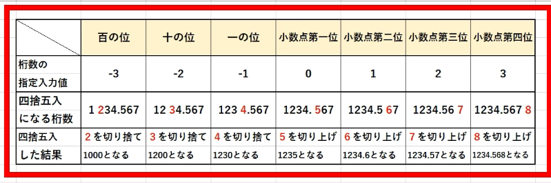 ↓解りやすく、表を分けて解説しますが、こちらの表が、ROUND関数を使うときの入力値を解りやすく表にしました。