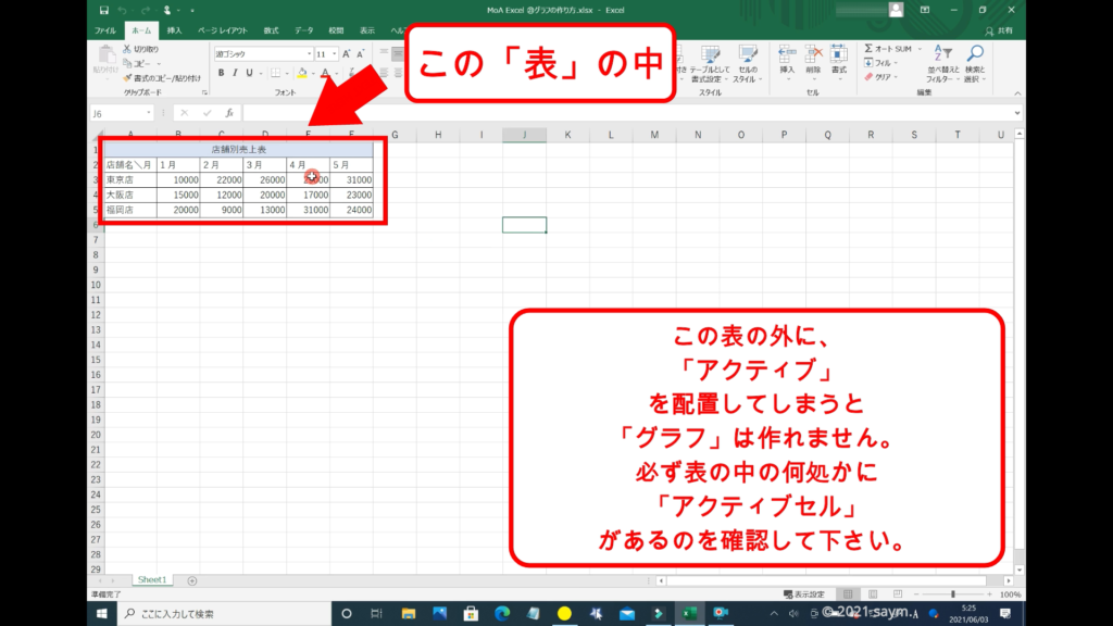 「グラフ」を作る時は、参照となる表の中に「アクティブセル」が配置されていないといけません。下記の画像は表の中に「アクティブセル」が配置されていません。(表の外に緑の枠が配置されている)