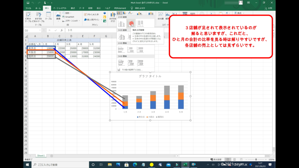 3店舗が足されて表示されているのが解ると思いますが、これだと、ひと月の合計の比率を見る時は解りやすいですが、各店舗の売上としては見ずらいです。