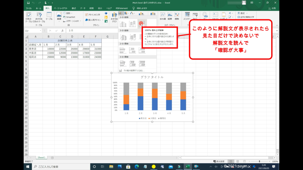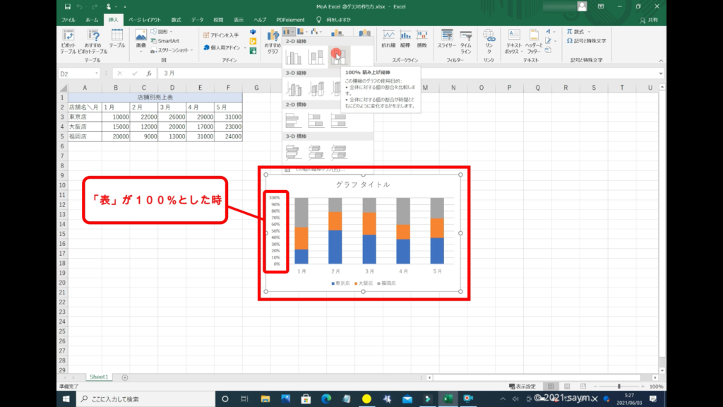 続いて、一番右のグラフに「ポインター」を翳すと、「100%積み上げ縦棒」と表示され、下のサンプル表を見ると、表が100%とした時の割合が表示されます。