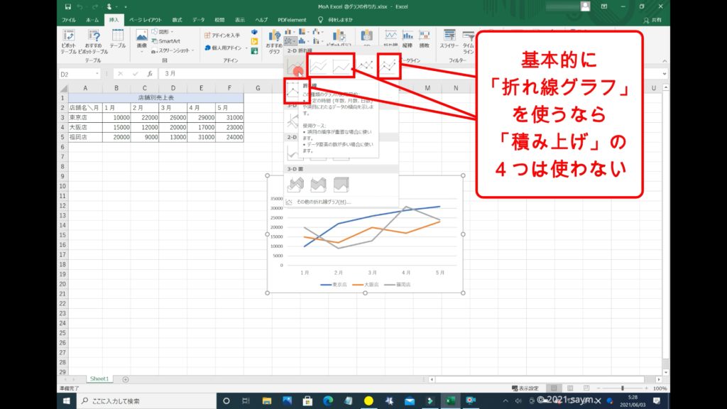 「折れ線グラフ」の注意点は、「棒グラフ」なら「積み上げグラフ」を使うこともあるかもしれませんが、「折れ線グラフ」だと分かりづらいので、「折れ線グラフ」を使うなら、「折れ線」もしくは「マーカー付き折れ線」のどちらかを使えば良いと思います。