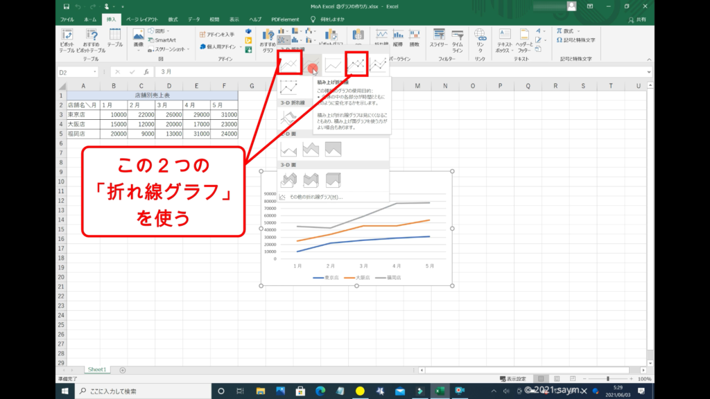 「折れ線グラフ」の方も、「折れ線グラフ」、「積み上げ折れ線」、「100%積み上げ折れ線」の3種類があります。
