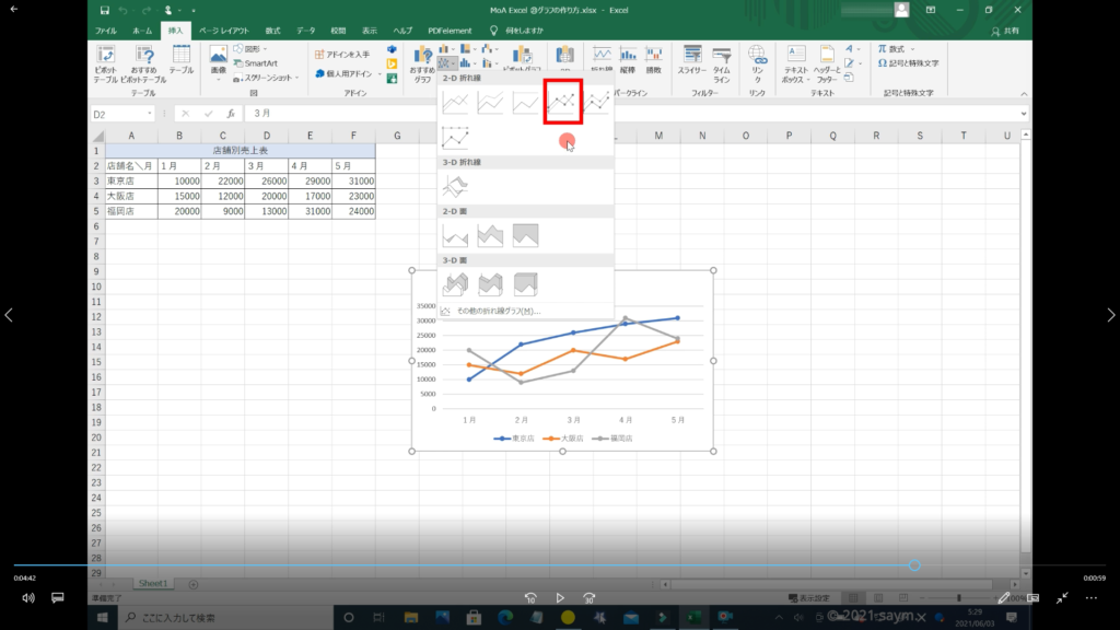 それでは、今回は、「マーカー付きの折れ線グラフ」をクリックします。
