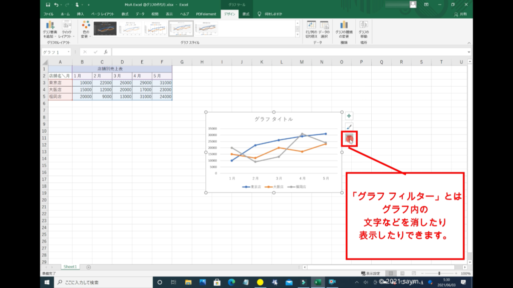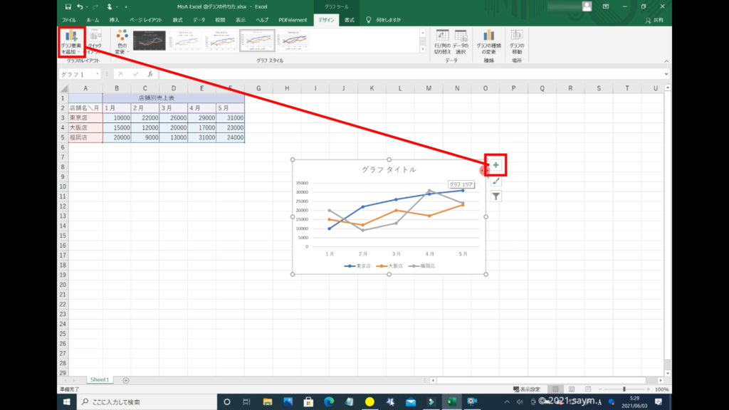 また、「グラフ」を選択している時は、「グラフツール」が「タブ」に表示されますが、「グラフ」の横にあるプラスマークは「グラフ要素」、筆みたいなのは「グラフスタイル」、漏斗みたいなのは「グラフフィルター」になり、こちらからでも変更が可能です。