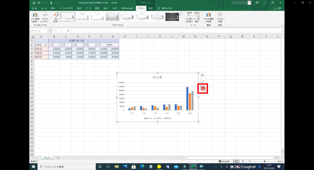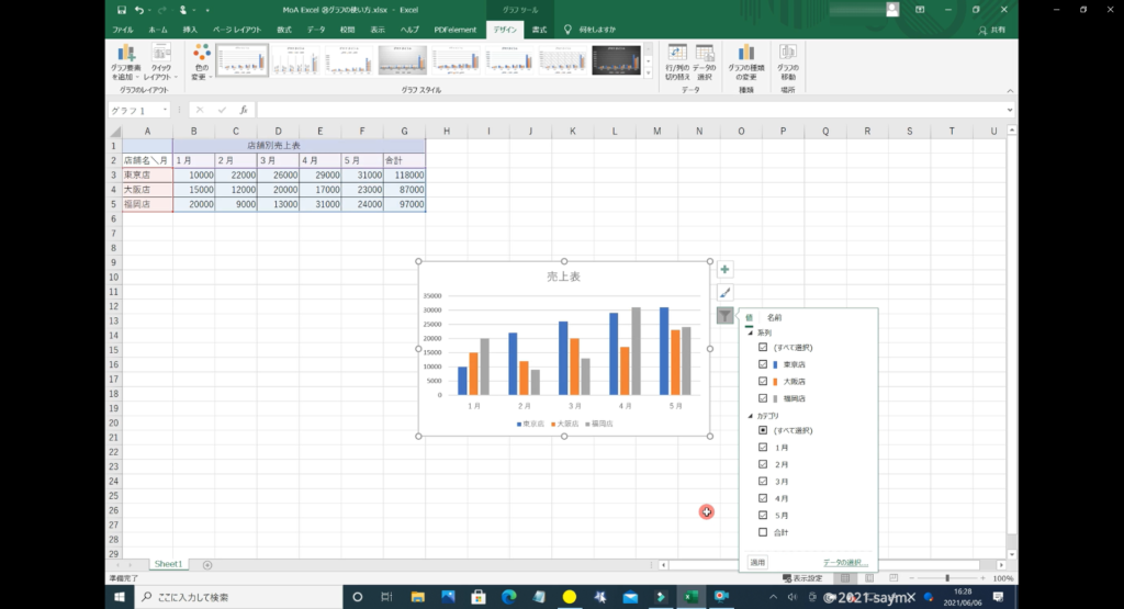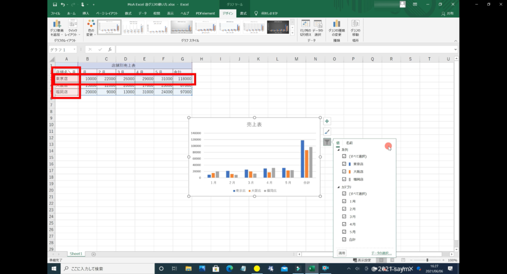 合計など、項目の列や行を、一つ一つ表示したり、非表示にしたい時は「グラフフィルター」