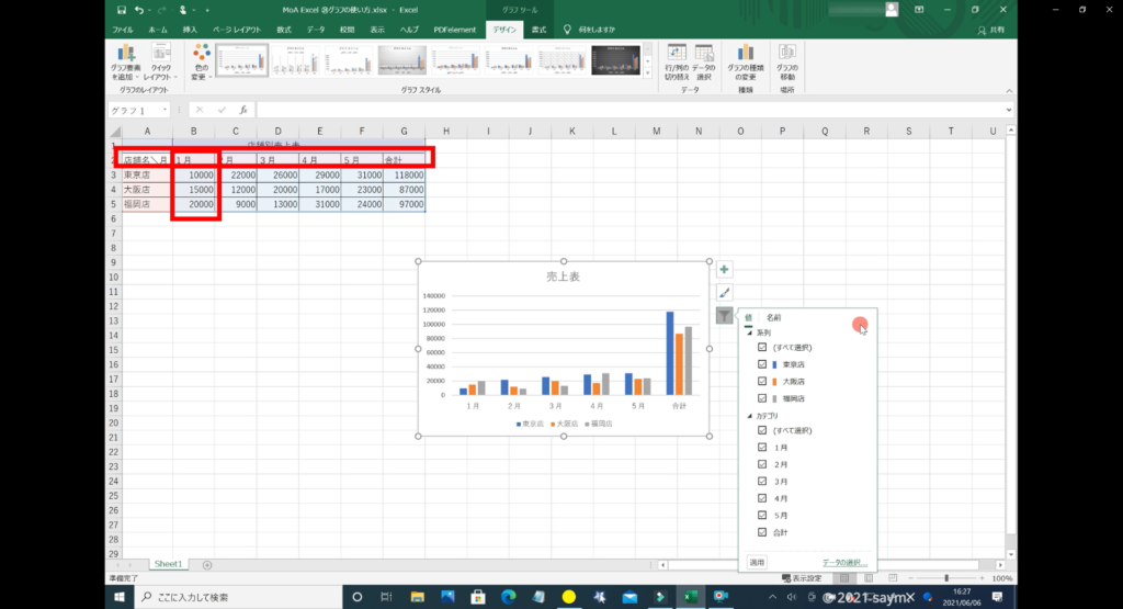 ここで、チェックを入れたり、外したりすると、グラフに要素を表示したり、非表示にしたりできます。