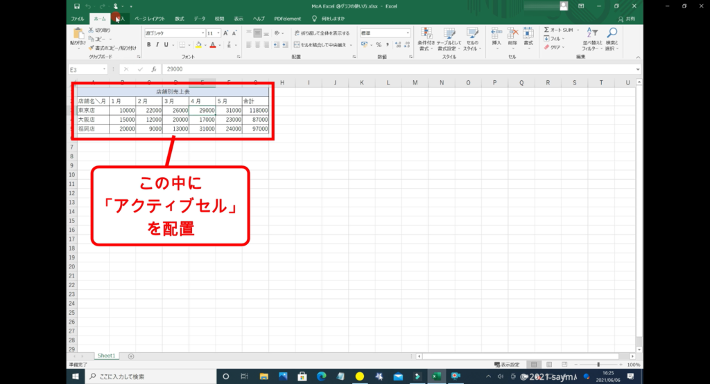 入力ができましたら表の外、どこでも良いのでクリックします。