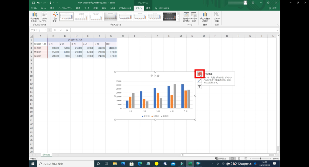 「グラフツール」の「デザインタブ」の、一番左にあるグラフ要素も同じです。