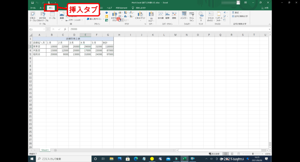 以前、グラフの作り方はしましたので、まず、グラフを作ります。