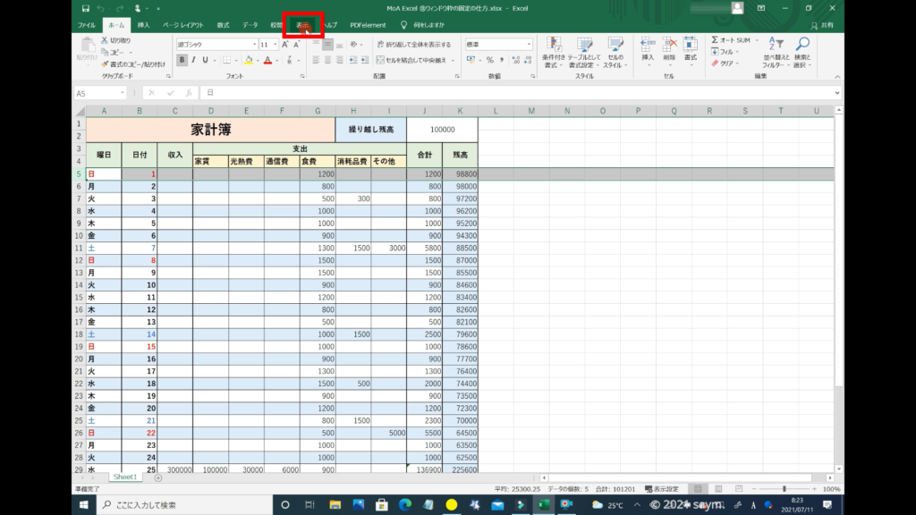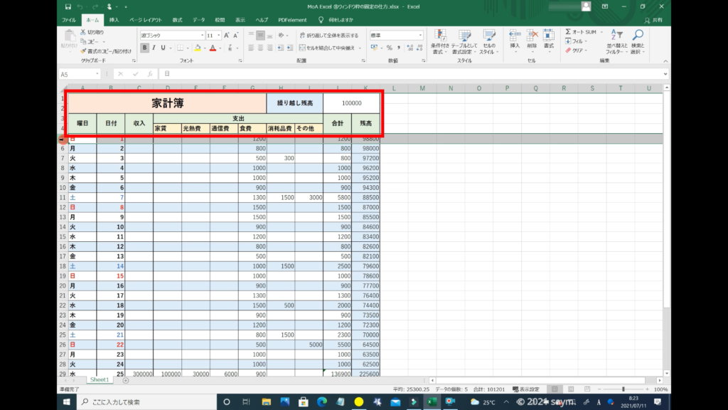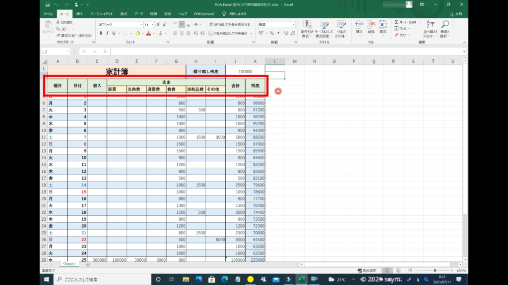 それでは、画像を使って解説していきます。表は、何でも良いのですが、今回は、このような家計簿の表で解説します。