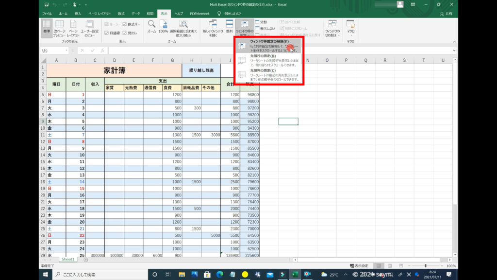 そうしますと、メニューが開き、先程はウィンドウ枠の固定だった場所が、ウィンドウ枠の固定の解除に変わっているので、コチラをクリックします。