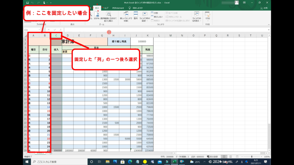 列を固定したい場合も、行と同じように、固定したい列の一つ後ろの列を選択して、ウィンドウ枠の固定をすれば良いだけです。(↓例)