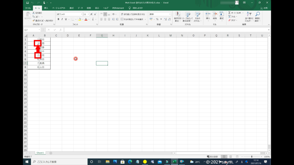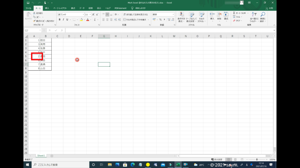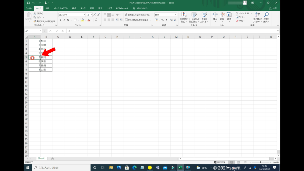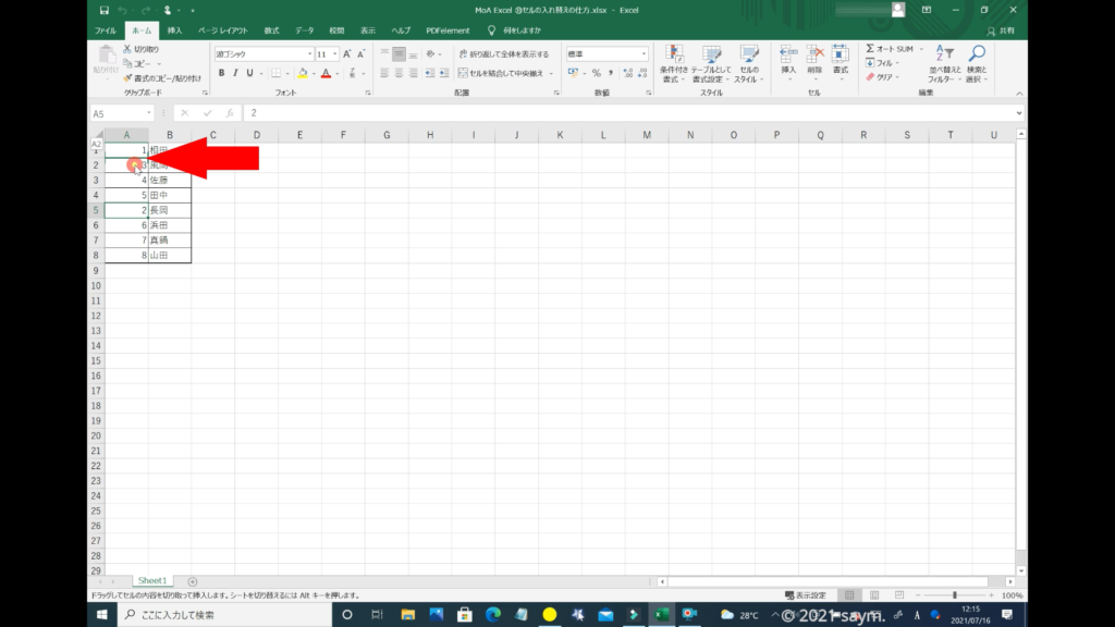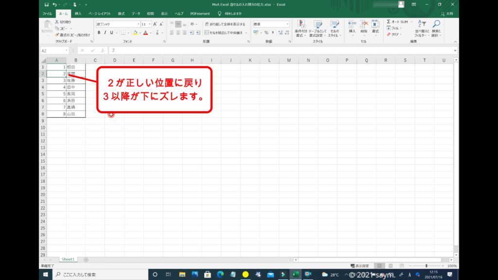 この、2番を、正しい位置にもっていく為に、一から入力し直したり、セルを挿入したりと、手間をかける方もいるかも知れません。