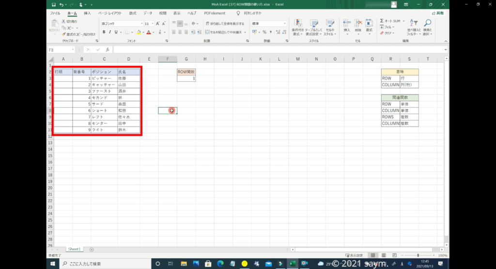 それでは、こちらの表を使って「ROW関数」の解説をしていきます。