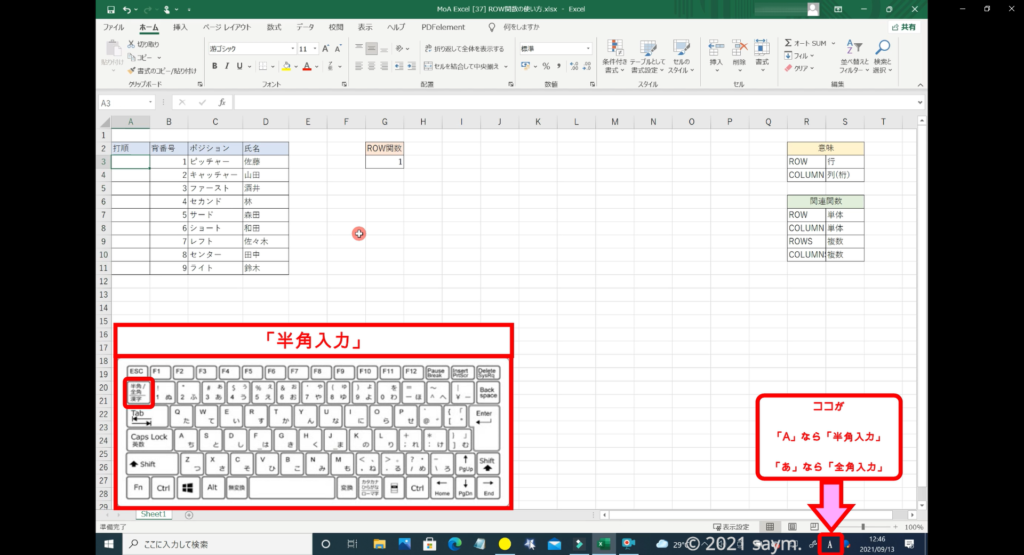 関数を入力する時は、半角入力なので、半角入力になっているか確認します。