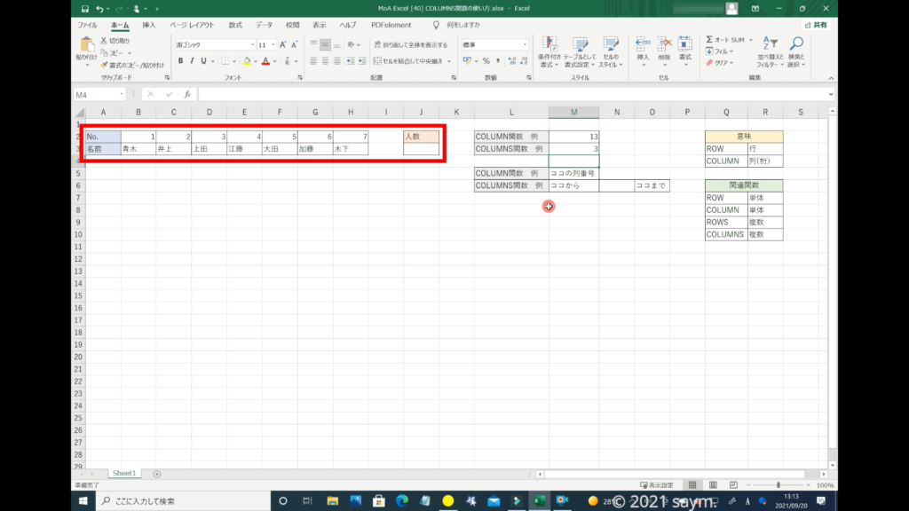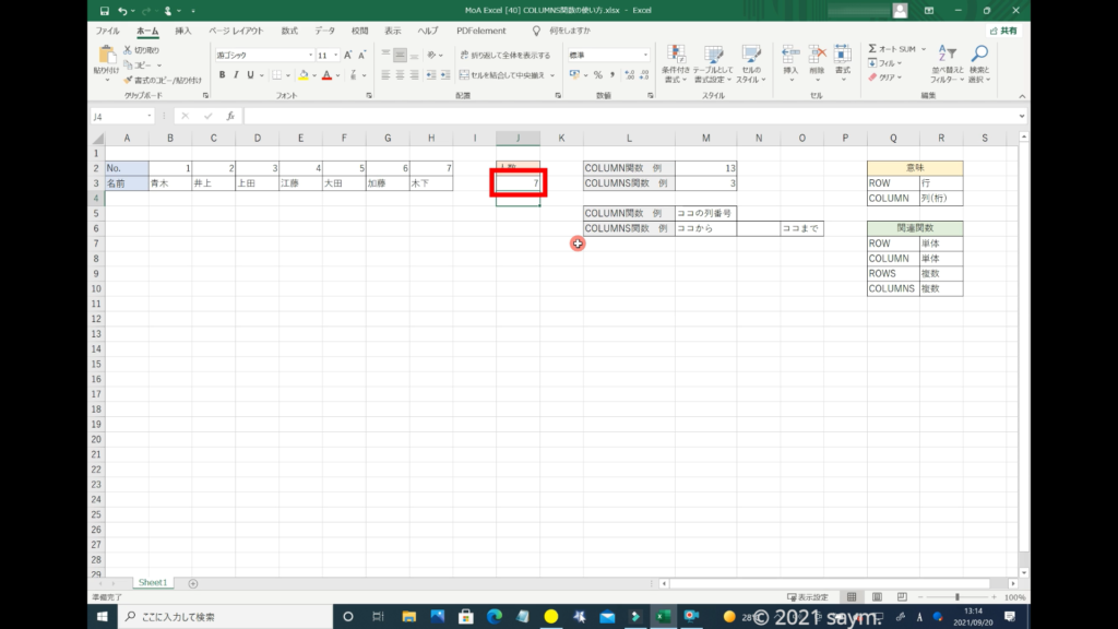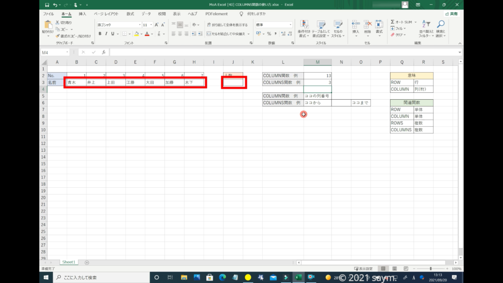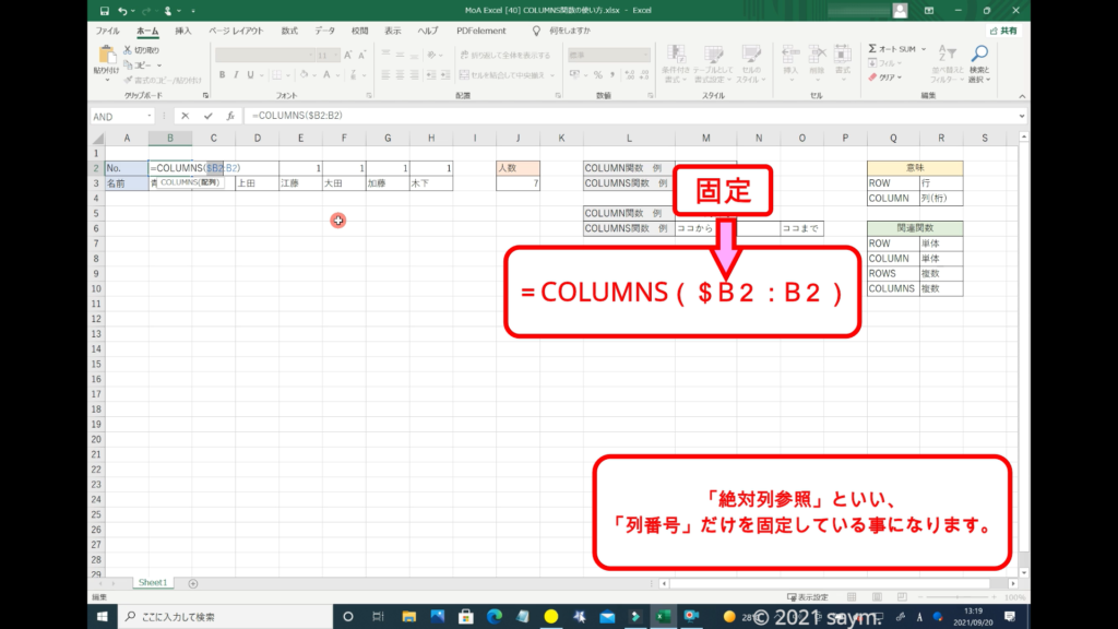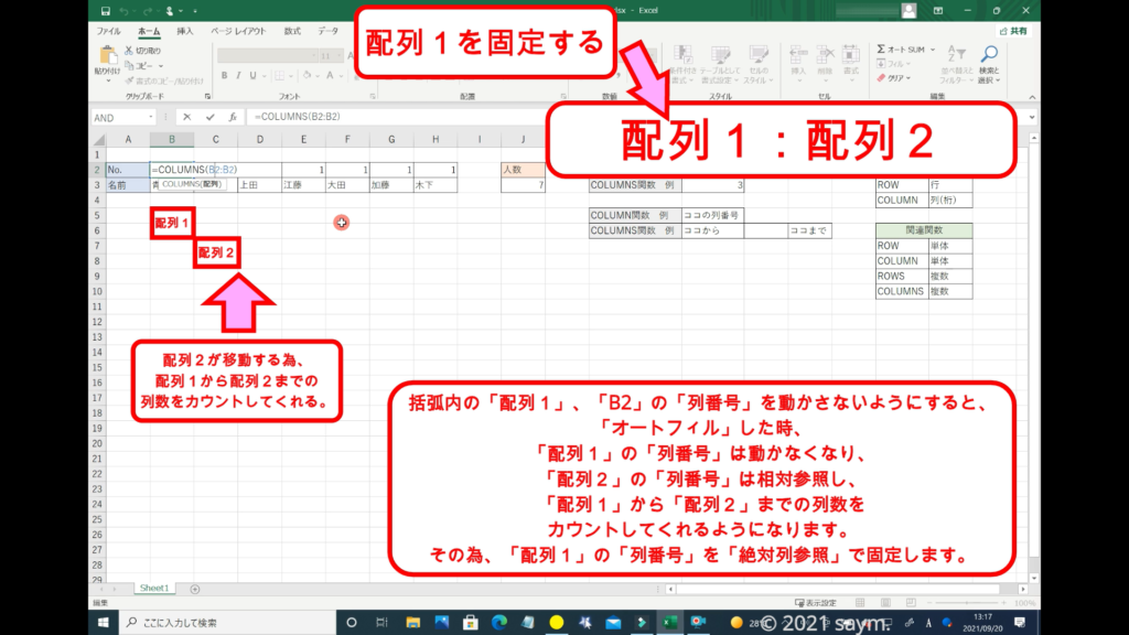 「COLUMNS関数」だと使えるようになり、移動させても数列が変わる事はありません。