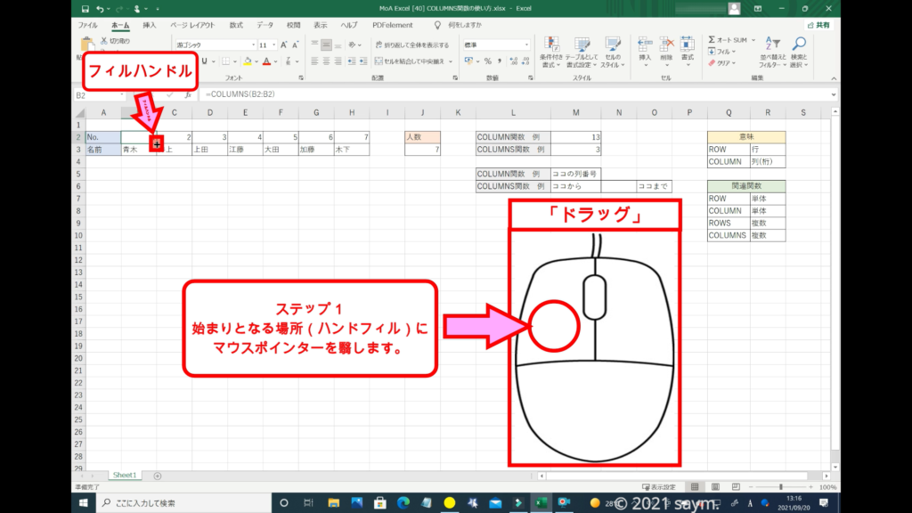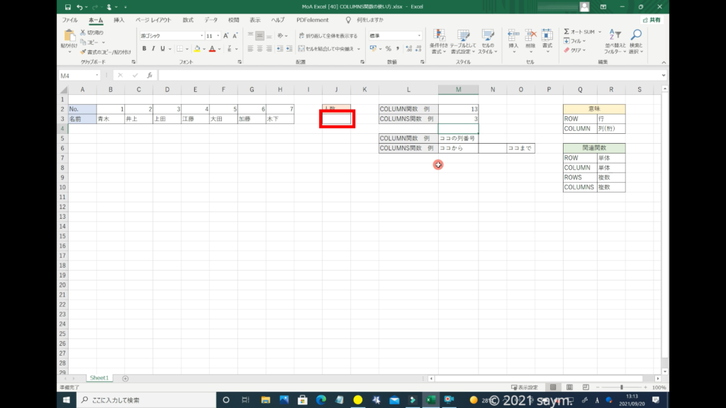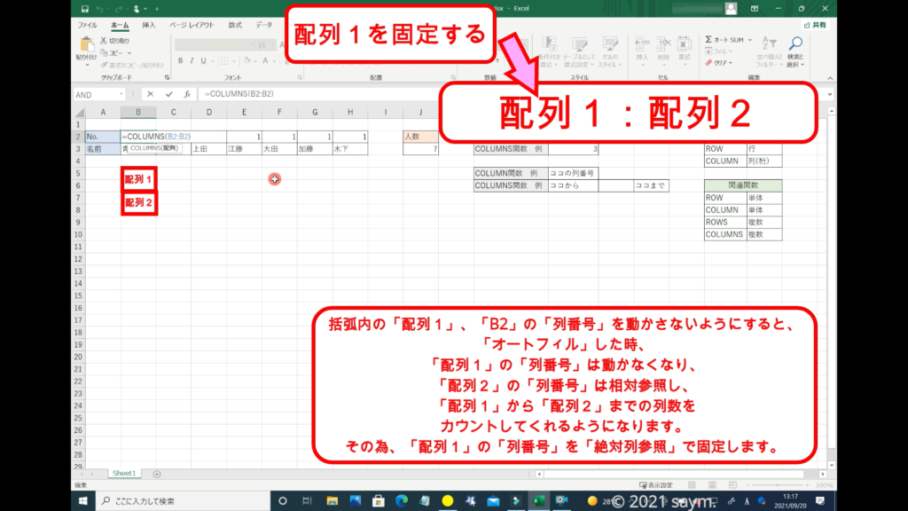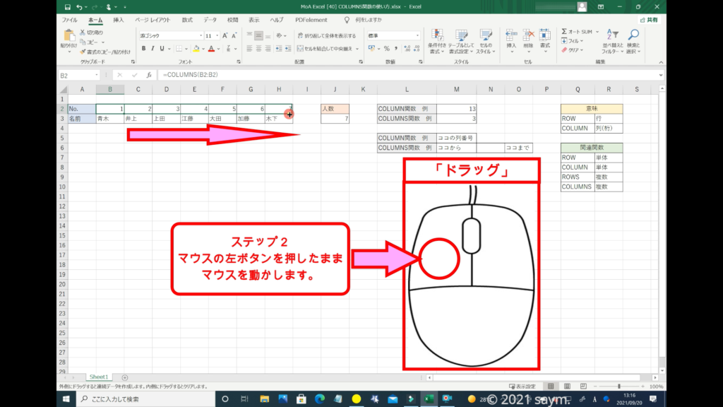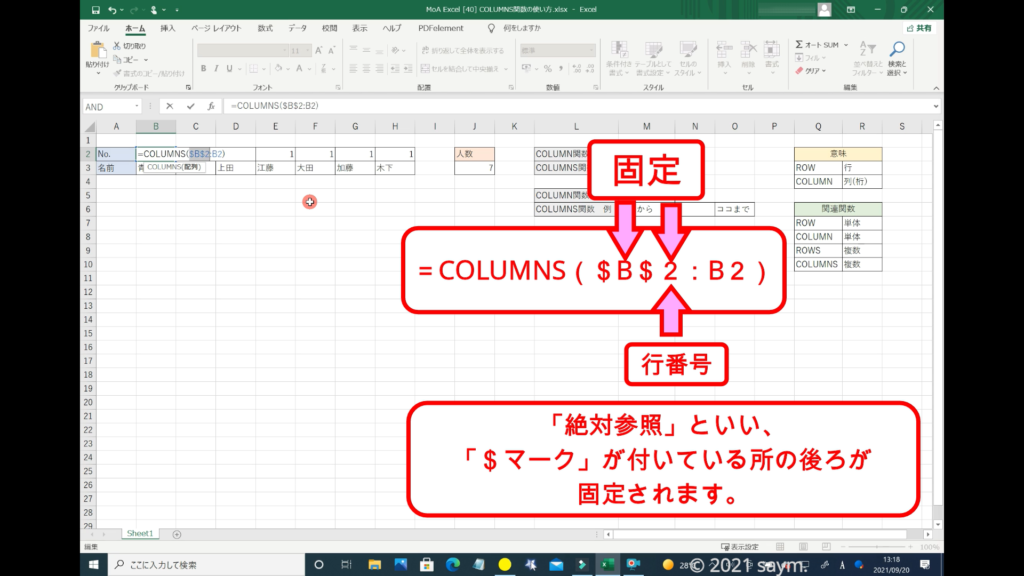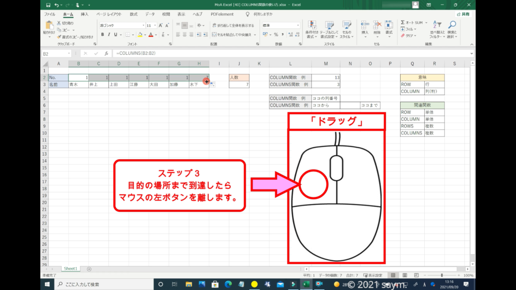 「COLUMNS関数」だと使えるようになり、移動させても数列が変わる事はありません。