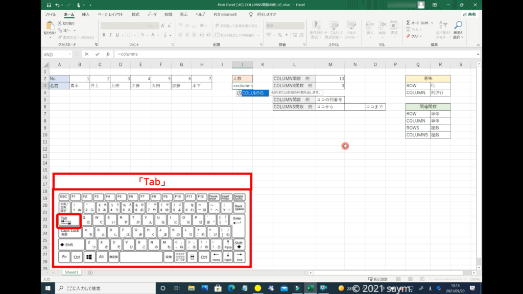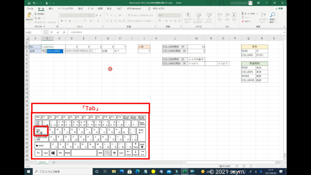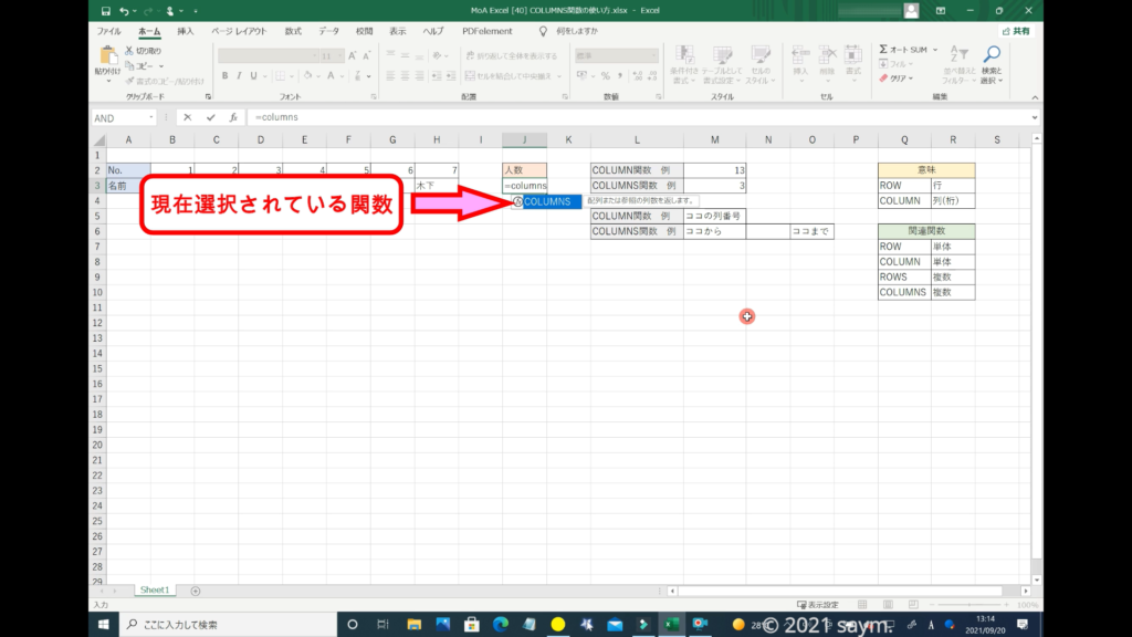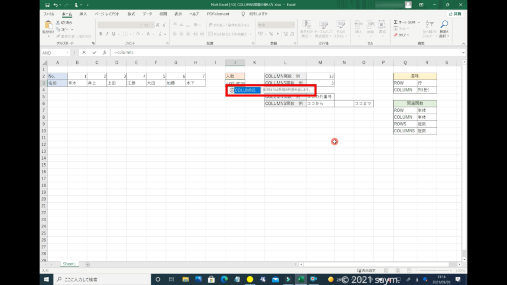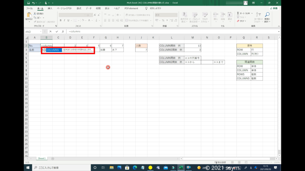 下に、「COLUMNS関数」が表示されます。