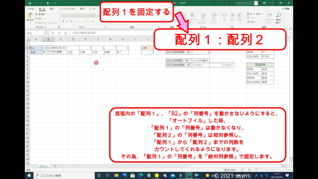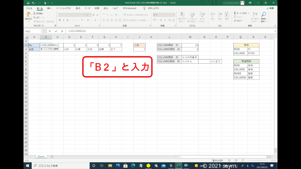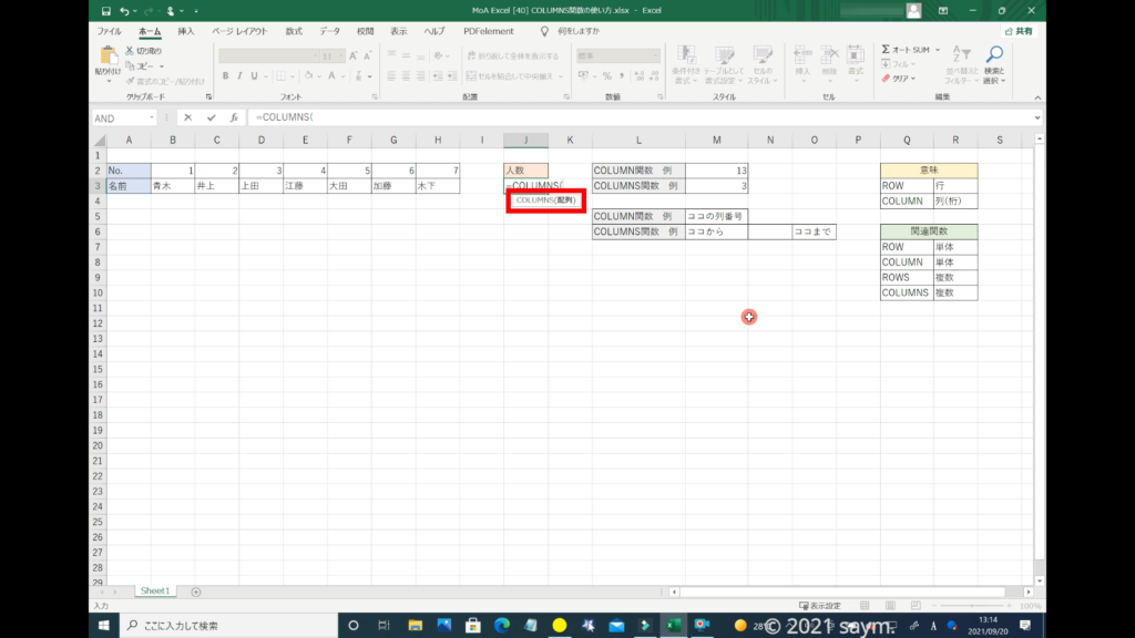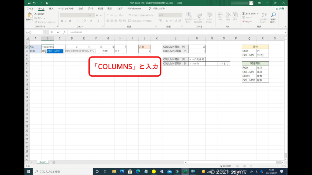 「COLUMNS関数」を使うので、「COLUMNS」と入力します。