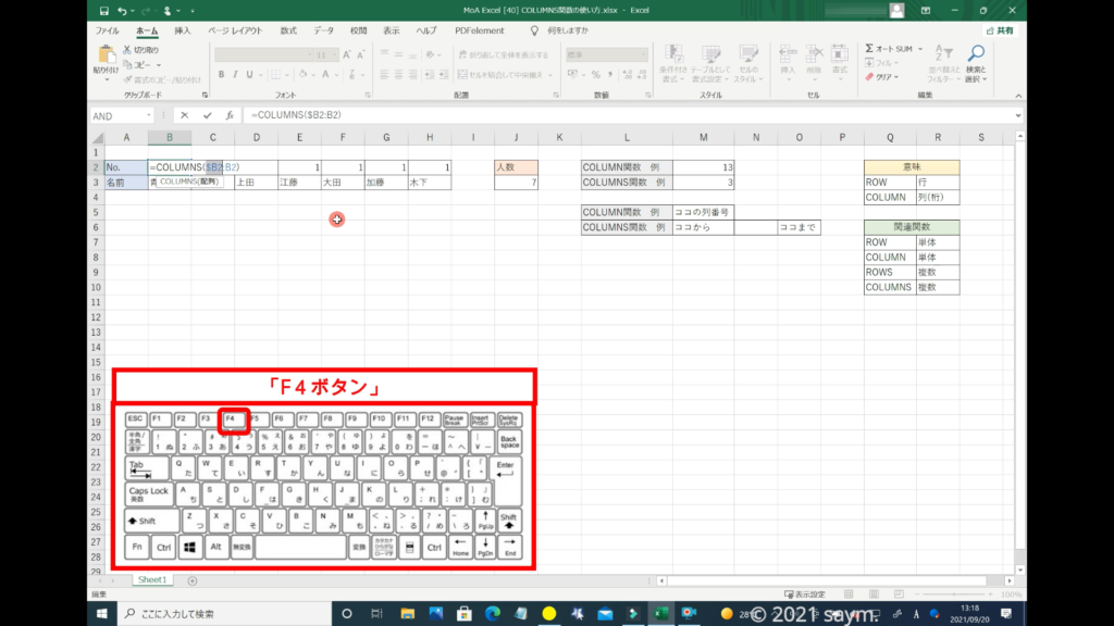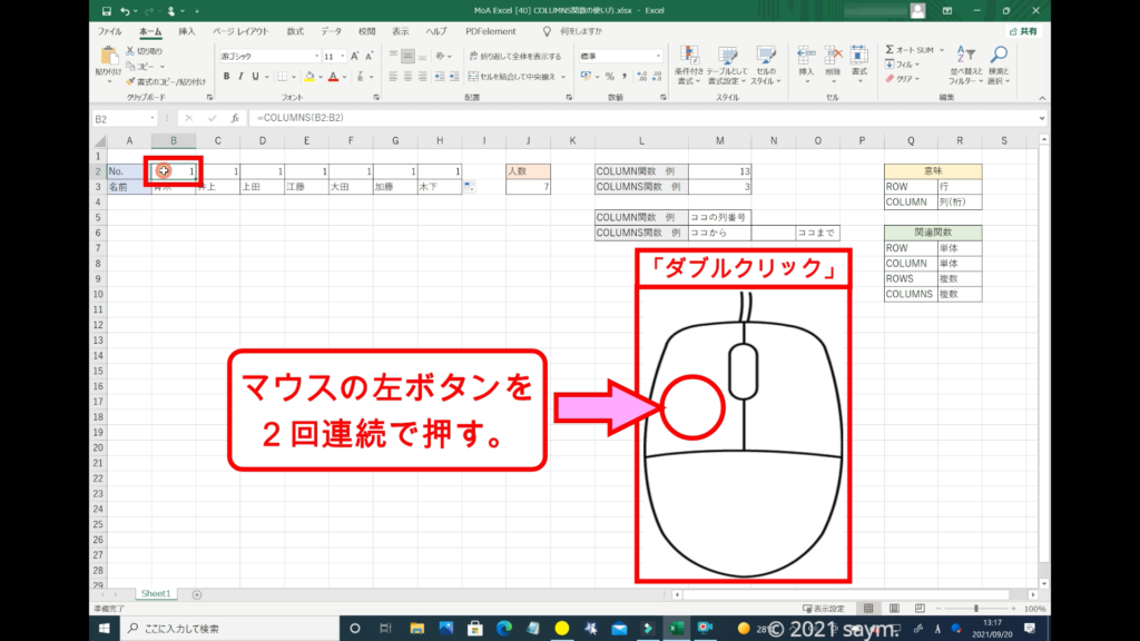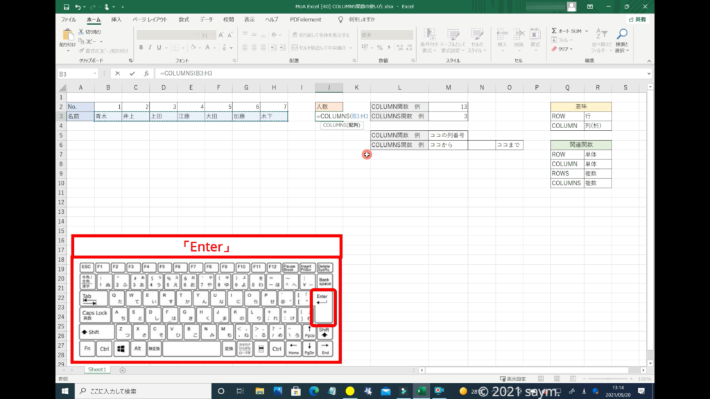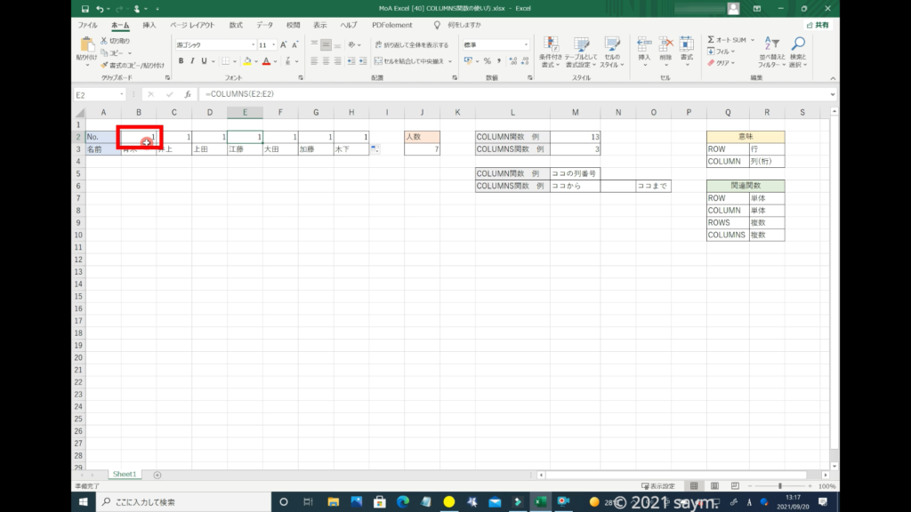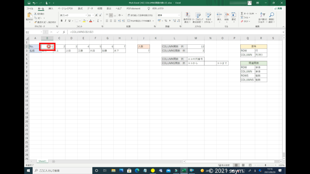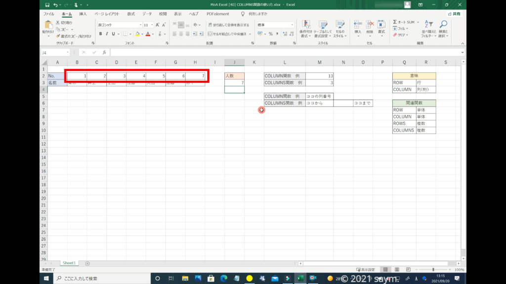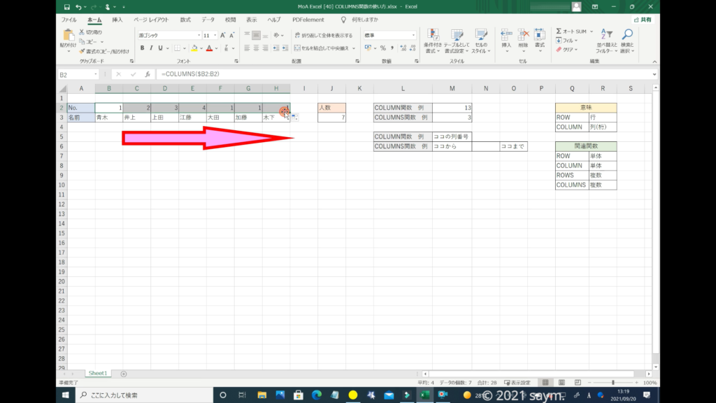 こちらの「COLUMN関数」で入力した番号を、「COLUMNS関数」で入力してみます。