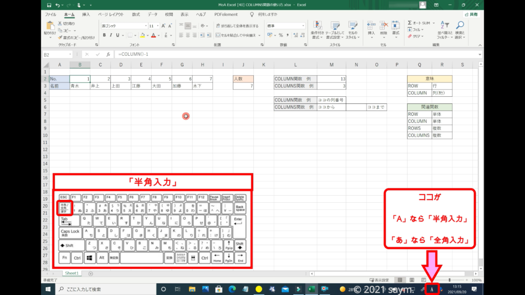 関数を入力する時は、半角入力なので、半角入力になっているか確認します。