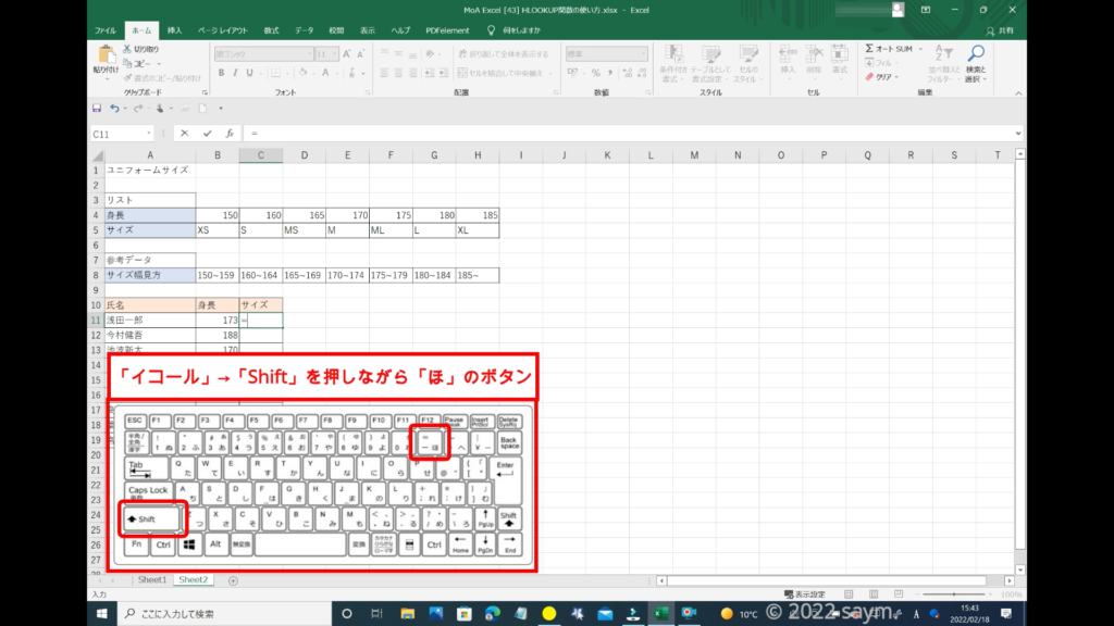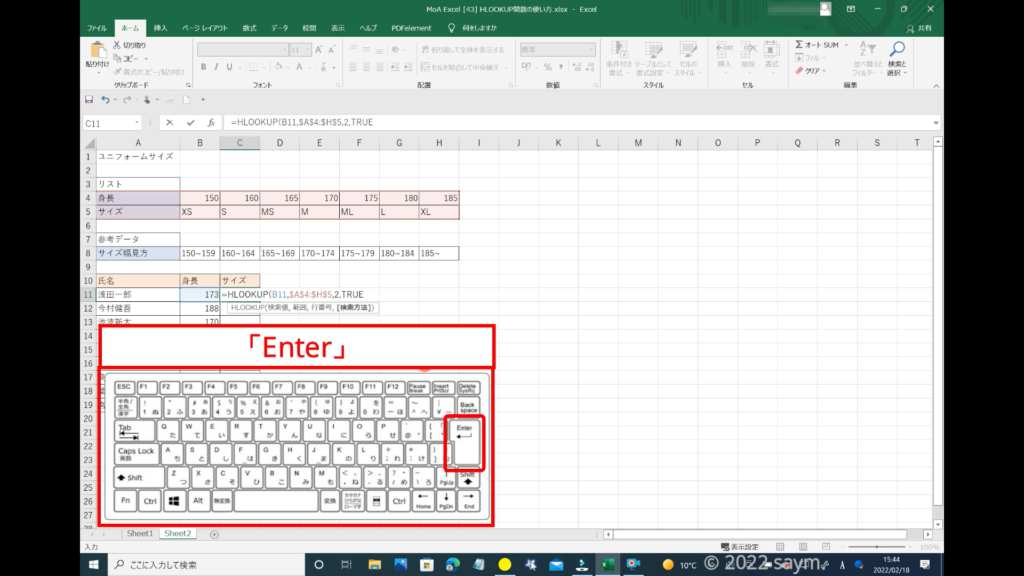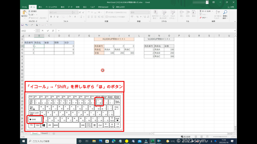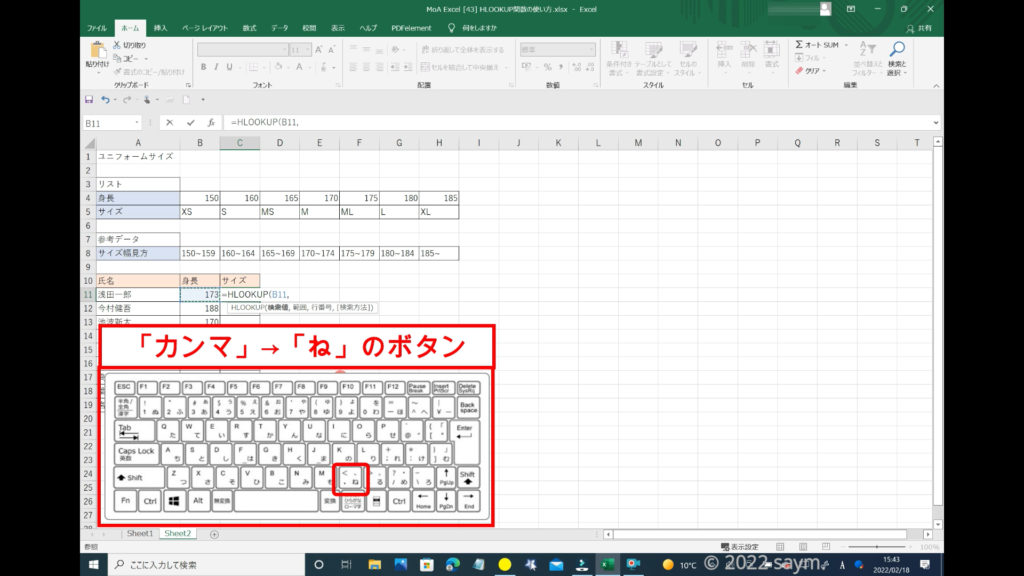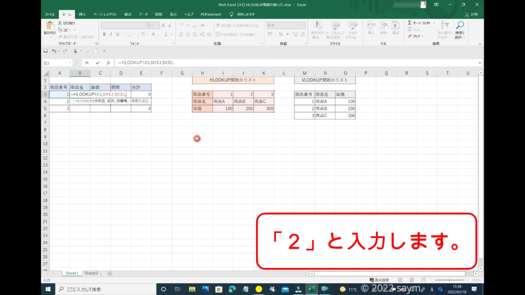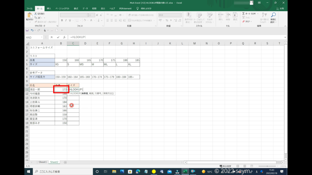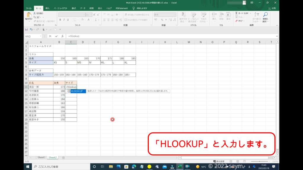 HLOOKUP関数を使うので、「HLOOKUP」と入力します。