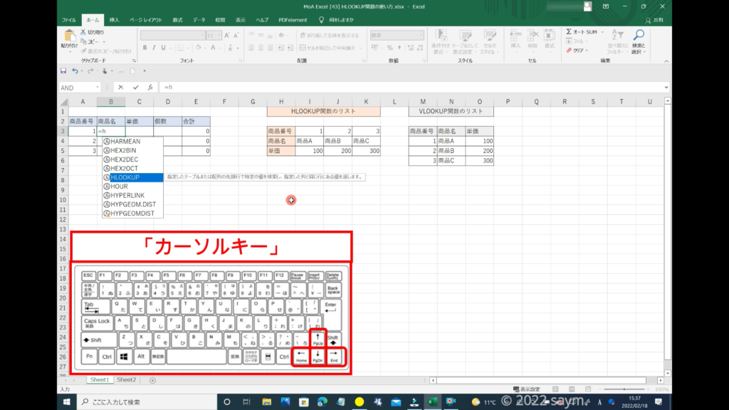もしくは、「H」と入力しましたら「キーボード」の「矢印キー」、「カーソルキー」とも言いますが、下矢印で、「HLOOKUP」の所まで移動します。