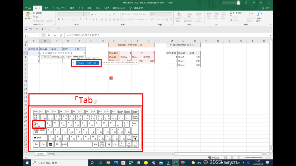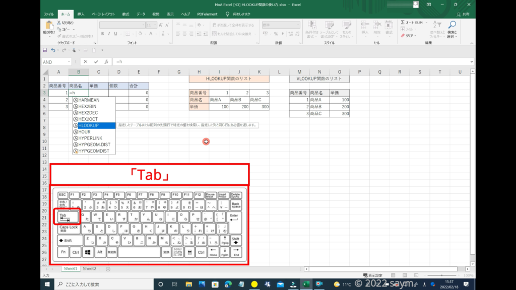 関数を選択する時は、Tabキーを押すと決定になりますので、「Tab」を押します。