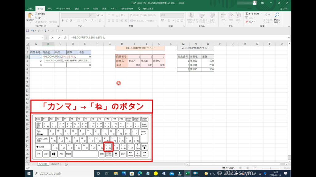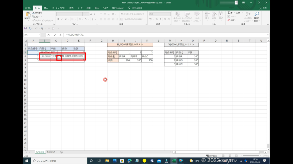 HLOOKUPが、青色になっていれば、OKです。