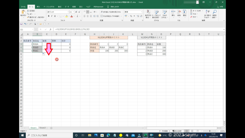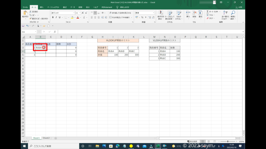 まずは商品名の値を、基盤となる商品番号から検索して算出していきたいので、算出したいセル、この解説では「セルB3」を「アクティブセル」にします。