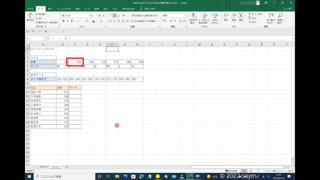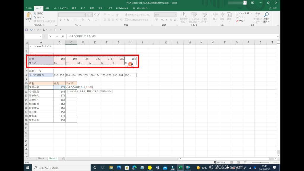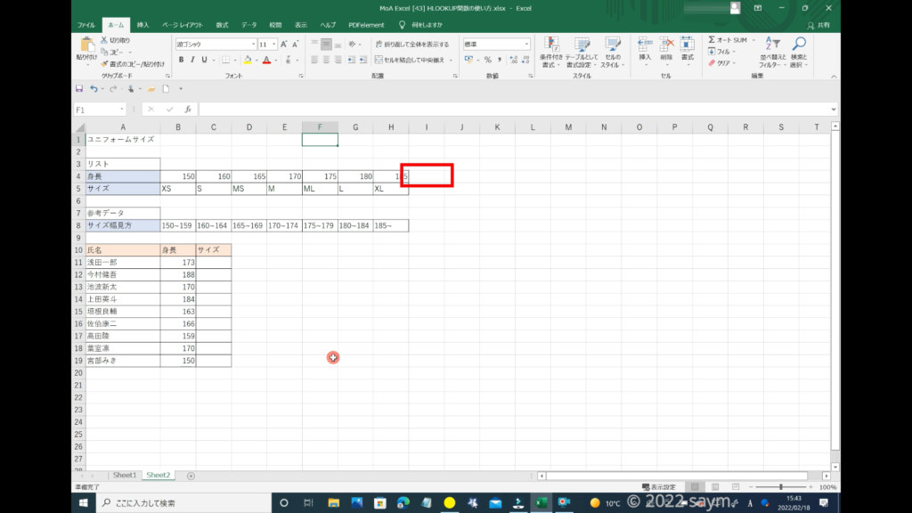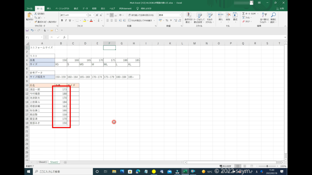 検索値は、対象者の身長になるので、身長の所を「カラーリファレンス」で囲みます。
