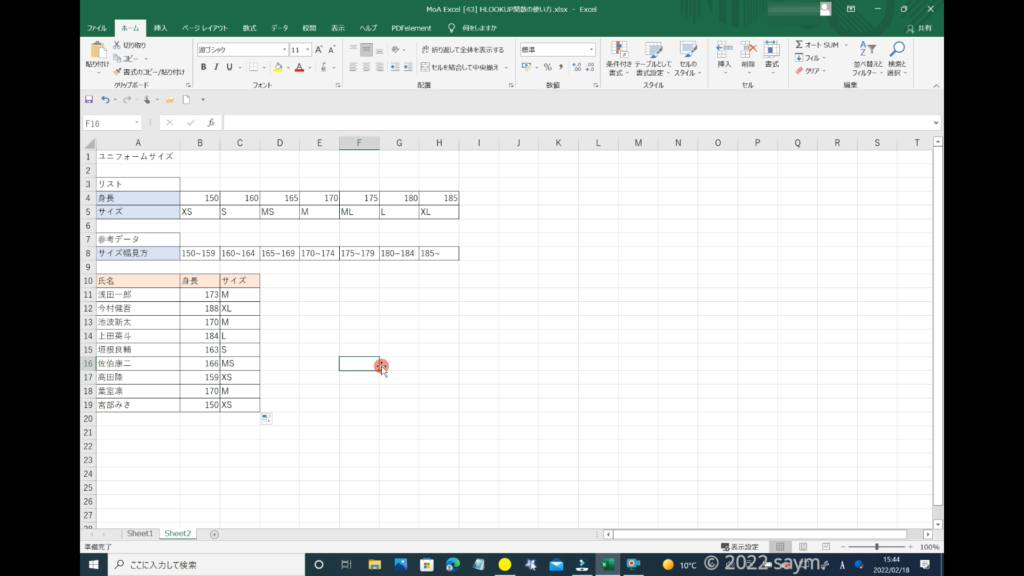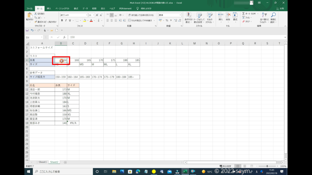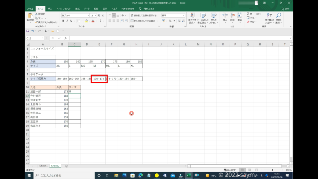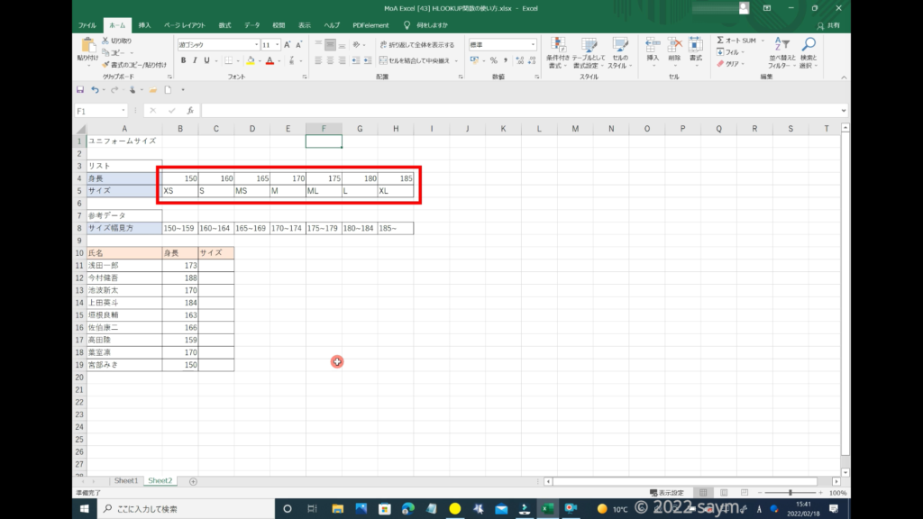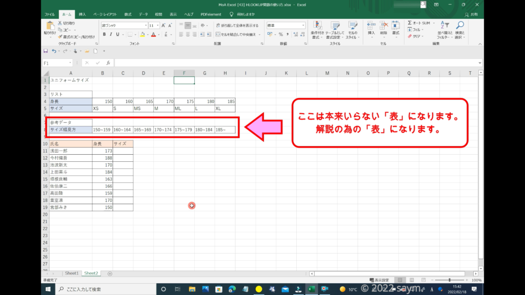 別シートにこのような「表」を作りました。これは、対象者の身長から対象者に合うサイズを検索する