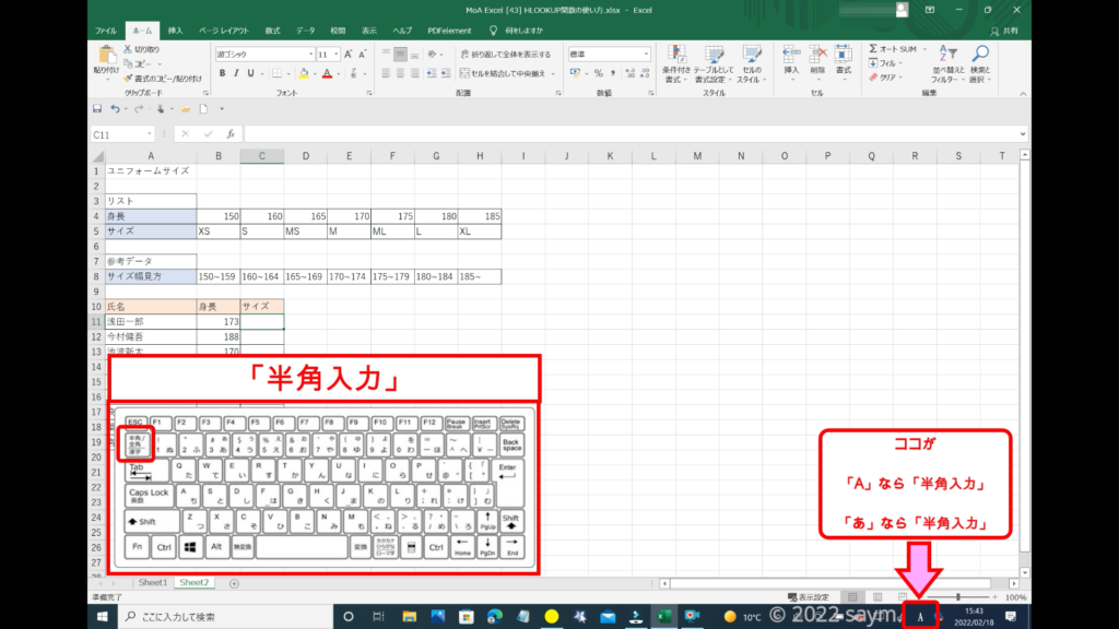 関数を入力していくので、半角入力になっているかを確認します。