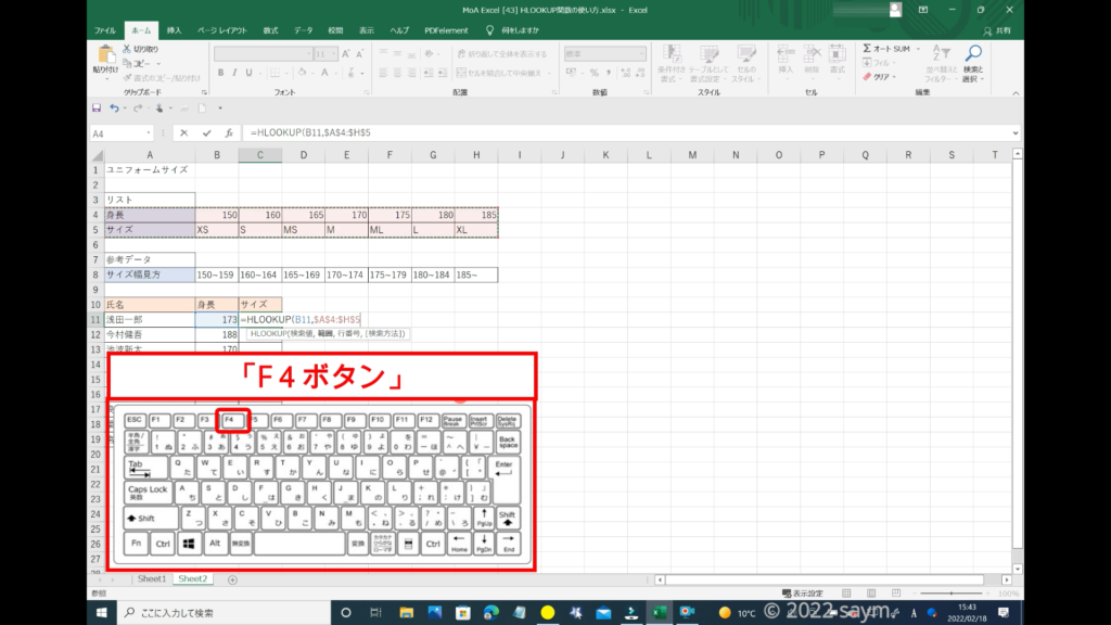 そして、範囲はズレると困るので、「F4ボタン」を押して絶対参照にしておきます。