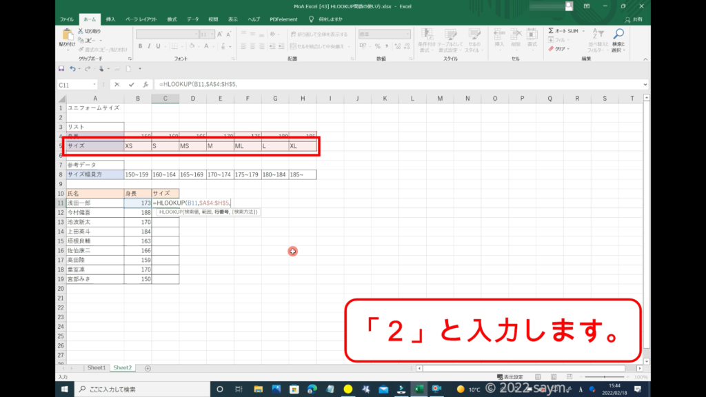 行番号は、2行目のサイズを知りたいので、「2」と入力します。